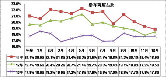 13年3-6月的兩廂占比持續回升,6月達到17.9%的相對高位; 但7-8月的兩廂份額環比6月下降1個百分點。9月的兩廂走強,節能車補貼政策的退出帶來小車的增量。而12月的兩廂份額環比回升是小型車的占比回升的促進,而12年12月的兩廂份額下滑是A級車的份額暴增的結果。