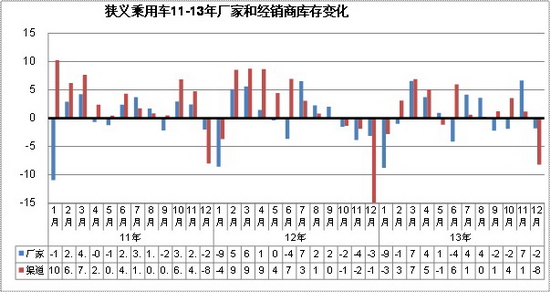 今年12月的廠家庫存減少2萬臺,經銷商庫存減少8萬臺,形成年末的廠商庫存雙降局面。今年廠商庫存增長力度遠低于11年同期,且相對12年11月的廠商庫存雙增,12月的庫存下降幅度不大。總體看今年渠道庫存增18萬,但多于12年的增庫存16萬,這對14年的車市增長帶來一定壓力。