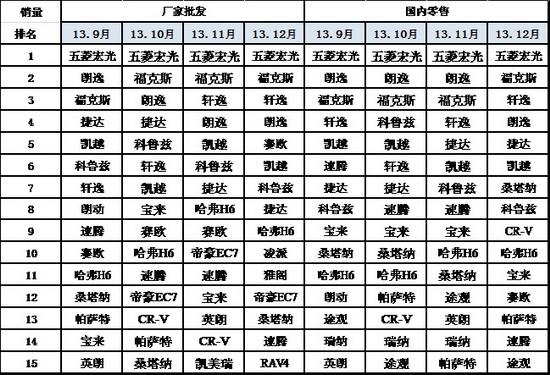 13年乘用車銷量領軍車型主要是歐美系包攬,朗逸和福克斯在夏季占據冠軍銷量車型月度較多,而五菱宏光在春秋季表現突出。隨著微客類MPV逐步轉入乘用車渠道,逐步分流兩廂轎車的份額,其增量潛力更大。