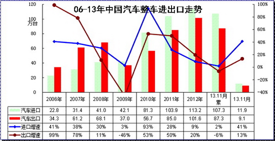 12年汽車行業的增長面臨雙向壓力,主要是進口的大幅減速和出口的低增長,這樣使國內需求的低迷仍未有效改善。13年的出口均低迷,國產廠家國內增長20%,而11月進口廠家銷量增長42%,出口增長5%,進出口不旺的局面迫切需要國內車市的本土化增長。
