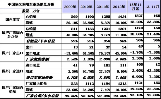 根據中國汽車工業協會數據,2013年1-12月的中國汽車累計批發量2198萬臺,增速為14%,較12 年累計增速增加10個百分點,這主要是12年日系低迷因素的基數偏低。