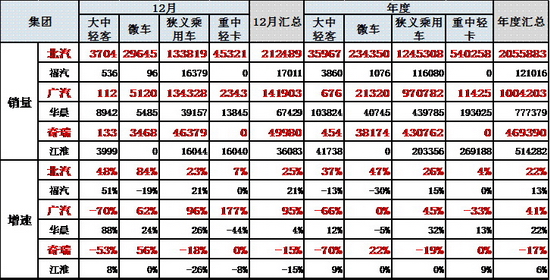 12月的幾大集團走勢均相對穩健,上汽依舊是領軍超強,而一汽和長安在20多萬的區間。長安的SUV表現超強,轎車表現也不錯。而上汽和東風的轎車走勢較強。大集團的卡車市場表現均很強。