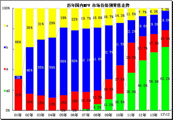 MPV 市場(chǎng)的起步時(shí)產(chǎn)品較少,GL8和普利馬形成MPV 的絕對(duì)主力。隨著02年奧德賽、瑞風(fēng)等的進(jìn)入,MPV 市場(chǎng)進(jìn)入以B級(jí)和C 級(jí)為主的時(shí)代。08年開(kāi)始的A0級(jí)MPV 逐步進(jìn)入,而且在10年取得17%的較好業(yè)績(jī)。隨著五菱宏光和長(zhǎng)安歐諾進(jìn)入,11年- 13年a0級(jí)MPV份額持續(xù)增長(zhǎng),13年到57%的高位,12月躍升到62%左右。