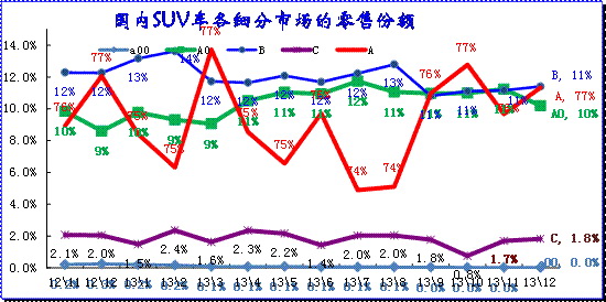 SUV市場(chǎng)的熱點(diǎn)發(fā)散后集中,現(xiàn)在又面臨熱點(diǎn)擴(kuò)大的趨勢(shì)。SUV 市場(chǎng)多年來(lái)依舊維持A級(jí)超強(qiáng)的走勢(shì),這其中的A 級(jí)包含所有的傳統(tǒng)皮卡型SUV的產(chǎn)品,這樣不影響總體分析效果。前幾年A級(jí)SUV份額出現(xiàn)持續(xù)的下降,這是市場(chǎng)發(fā)散的結(jié)果。而11年-12年的A級(jí)SUV份額增長(zhǎng),13年12月的份額回落到77%,這主要是小型SUV新品的促進(jìn)。13年的A0及份額增長(zhǎng)到10.6%,12月達(dá)到10.2%,這也是SUV市場(chǎng)發(fā)散化的趨勢(shì)。