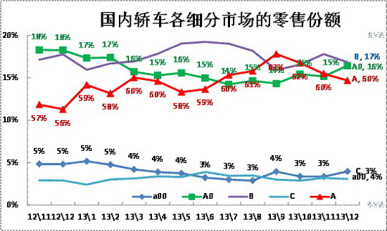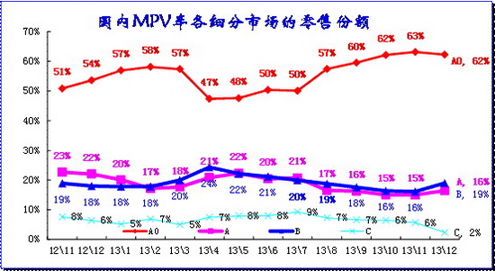 同樣的A0級(jí)車(chē)和B級(jí)車(chē)的份額也是在17%左右徘徊的,12年11月至13年3月的B級(jí)車(chē)份額受日系銷(xiāo)量下滑而回落,4月的B級(jí)車(chē)超越AO級(jí)而恢復(fù)地位,8月的A0級(jí)車(chē)已經(jīng)反超B級(jí)車(chē),9-12月的A0級(jí)車(chē)因微客類(lèi)MPV而份額偏高。而A級(jí)車(chē)作為車(chē)市的核心支柱,其份額近期在59%左右緩步上升,13年12月達(dá)到60%,形成穩(wěn)定的主力市場(chǎng)。