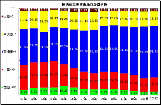此圖應(yīng)分兩部分看,01-08年的走勢(shì)和09-12年的變化兩部分。從01年到08年的總體走勢(shì)是高級(jí)別下壓,A級(jí)車(chē)型表現(xiàn)較強(qiáng),09-12年是重演05-08年的趨勢(shì)。但13年的經(jīng)濟(jì)型車(chē)低迷急速?lài)?yán)峻。