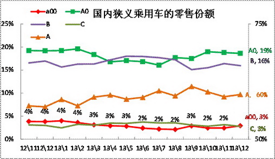 狹義乘用車(chē)的國(guó)內(nèi)零售市場(chǎng)的高低端車(chē)型的份額似乎是對(duì)等的重合狀態(tài),A00級(jí)車(chē)近期和C級(jí)車(chē)的份額圍繞3%的中位越來(lái)越近,去年11月至春節(jié)的A00級(jí)反超C級(jí),但13年春節(jié)后的兩個(gè)級(jí)別的份額又相近了,且13年4-8月的C級(jí)車(chē)超越A00級(jí),今年9月的A00級(jí)走勢(shì)有暫時(shí)反彈恢復(fù)的趨勢(shì),但10-11月的A00級(jí)份額又低于C級(jí)。12月的C級(jí)車(chē)收縮和A00級(jí)沖量的反差形成新的重疊趨勢(shì)。