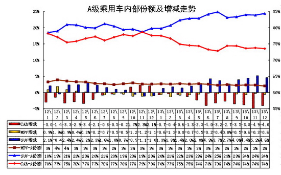 每年3月開始的SUV份額上升,12年和13年的3-7月的SUV占比都是持續上升。12年的8月開始SUV份額下降,而 13年8月到12月的SUV份額相對穩定,這樣的趨勢也導致12月的SUV份額達到24%,同比增長4.6個百分點。而MPV的份額持續小幅下降。