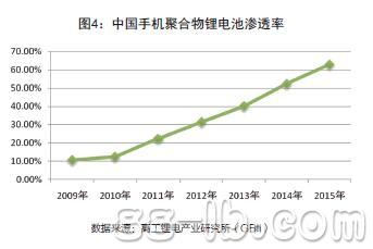 據(jù)高工鋰電產(chǎn)業(yè)研究所(G B I I)統(tǒng)計(jì),2 0 0 9年,聚合物鋰離子電池在手機(jī)電池中的應(yīng)用比例為10.7%,而到2012年,聚合物鋰離子電池的應(yīng)用比例已經(jīng)達(dá)到了32.5%。預(yù)計(jì)在未來的幾年中,隨著國內(nèi)3G市場(chǎng)的逐步成熟,以及智能手機(jī)滲透率的快速上升,聚合物鋰離子電池將是未來手機(jī)電池中的主流,而相應(yīng)的也將帶動(dòng)其市場(chǎng)滲透率的快速上升。到2015年,聚合物鋰離子電池在手機(jī)中的應(yīng)用比例將達(dá)到63.5%。(圖4)