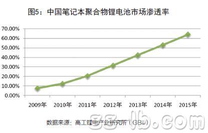 據(jù)高工鋰電產(chǎn)業(yè)研究所(GBII)統(tǒng)計(jì),2009年全球筆記本電池采用聚合物電池的比例僅為7.6%。到2012年,聚合物鋰離子電池在筆記本電腦中的滲透率已經(jīng)達(dá)到了31.5%。預(yù)計(jì),聚合物鋰離子電池的市場(chǎng)滲透率在2015年將達(dá)到64%。(圖5)聚合物鋰離子電池作為未來幾年數(shù)碼電池發(fā)展的方向,這將給鋰電池的發(fā)展帶來很大的影響。因?yàn)?,在?dòng)力鋰電池、大型儲(chǔ)能市場(chǎng)還未大規(guī)模打開的情況下,手機(jī)電池仍然將作為鋰電池的最為主要的應(yīng)用領(lǐng)域。同時(shí),手機(jī)鋰電池應(yīng)用結(jié)構(gòu)的變化,將毫無疑問給其他數(shù)碼產(chǎn)品鋰電池的的應(yīng)用結(jié)構(gòu)帶來影響。