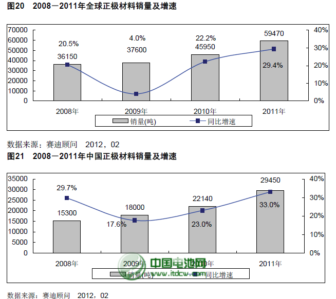 賽迪顧問認(rèn)為未來兩年隨著新能源汽車對動力電池需求的擴(kuò)大,再加上儲能電站對儲能電池需求的日漸膨脹,正極材料行業(yè)銷量將在2011年的基礎(chǔ)上出現(xiàn)快速的增長,而國內(nèi)的增速因?yàn)榫薮蟮男枨罂臻g和現(xiàn)有的良好基礎(chǔ)而快于全球增速。