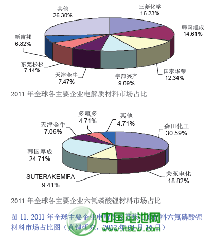 得益于三星SDI 和LG 化學這兩家韓企這兩年在鋰離子電池市場所占份額的顯著增加,同時得益于日本311 大地震對日本電解液企業的影響,2011 年韓國旭成的電解液市場份額也超越了宇部興產,排名全球第二位。2011 年韓國旭成共產銷電解液材料約4,500 噸,比2010 年有所增加,全球市占率為14.61%。美國諾萊特(Novolyte,公司總部位于美國俄亥俄州(Ohio)克里夫蘭市,前身為美國福祿集團(Ferro)的精細化工事業部)科技2011 年實現電解液材料銷量約1,000 噸,基本上都是由其在蘇州的生產基地貢獻的。