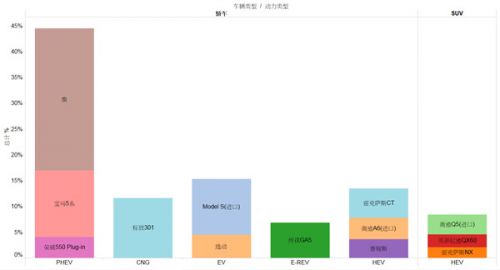 從動力類型來看,SUV車型目前主要集中在傳統混合動力(HEV)類型中,PHEV類型中并未出現SUV,純電動車中,除品牌知名度最高的特斯拉外,用戶對產品的關注還是主要集中在了長安逸動EV這款車型上,表現出逸動EV在該細分市場具有一定的競爭力,而HEV車型中排名前三的均以進口合資車型為主。