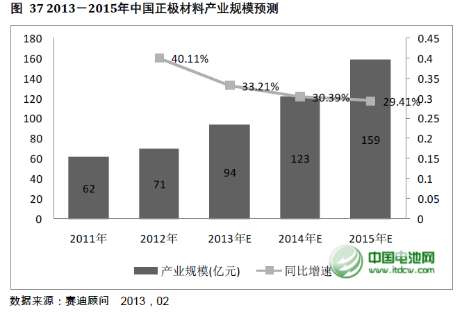 就中國產業而言,得益于動力鋰離子電池的快速發展,2013年正極材料產業整體產業規模將達到94億元,同比增長33.2%,并且未來三年市場規模增速均會保持在30%以上,到2015年整個中國正極材料產業的市場規模將達到159億元。