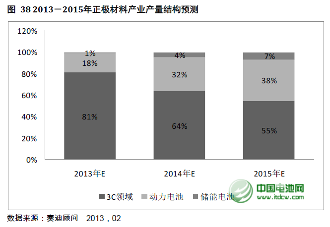 從鋰離子電池市場結構來看,中國電池網-中國電池雜志戰略合作機構——賽迪顧問認為正極材料規模未來三年內增長的動力來自于以新能源汽車電池為代表的動力電池。到2015年鋰離子動力電池市場規模占比將達到38%。