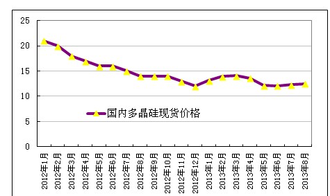 2013 年 7-8 月份我國多晶硅價格呈溫和上漲的態勢,7 月初我國對美、韓反傾銷初裁出臺之前多晶硅現貨報價為 10.5-13.5 萬元/噸,均價維持在 12.27 萬元/噸左右,2013 年 7 月 18 日商務部發布公告對產自美韓的太陽能級多晶硅采取臨時反傾銷措施后,多晶硅價格小幅溫和上漲至 8 月底的 12.60 萬元/噸,增幅為2.7%。