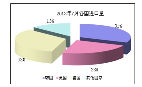 據 7 月份分國別進口數據顯示,自韓國、美國、德國進口量占總進口量的87.2%,其中從韓國進口量為 2171 噸,占總進口量的 31.5%;從美國進口量為1575 噸,占總進口量的 22.9%;從德國進口量為 2254 噸,占總進口量的 32.8%;其他地區進口量為 879 噸,僅占總量的 12.8%。2013 年 1-7 月份累計從韓國、美國、德國進口量為39880噸,占累計進口總量的86.7%,其中從韓國累計進口11280噸,從德國累計進口 14537 噸,從美國累計進口 14064 噸。7 月份進口數據顯示,自美國、韓國和德國進口多晶硅量均有不同程度增加,其中自韓國進口量增幅最大,為 126%。這也從側面反映出此次多晶硅初裁對韓國征收的反傾銷稅率確實偏低,嚴重影響了救濟效果。