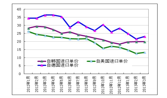 圖 5 2012 年和 2013 年從韓、美、德進口多晶硅單價走勢圖 數據來源:海關