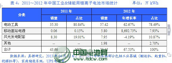 2012年全球鋰離子電池需求總量中,工業(yè)&儲能市場消耗了467.36萬kWh,占比12.25%;中國的這個市場共消耗鋰離子電池73.15萬kWh,比重是15.65%,要適當(dāng)高于全球。這主要是因為,在大型儲能系統(tǒng)的技術(shù)開發(fā)和應(yīng)用上全球基本處于同步的情況下,中國電動工具用鋰離子電池市場需求的占比稍大。但是,中國該市場鋰離子電池需求的年增速不及全球,主要原因是在移動基站電源的使用上,中國鋰離子電池替代鉛酸電池的速度適當(dāng)滯后于全球。
