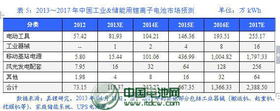 工業(yè)&儲能市場目前還難以估算出它到底有多大規(guī)模,不過誰都知道,這是繼電動交通工具之后的鋰離子電池的又一個潛力無窮的藍海市場。這個市場的不少細分市場如工業(yè)器械市場、風(fēng)光發(fā)電配套及電網(wǎng)儲能市場、家庭儲能市場以及除移動基站電源之外的其他UPS電源市場,目前尚未有足夠的信息來支撐真鋰研究做出較為準確的判斷和預(yù)測,因此,表5中的相關(guān)預(yù)測僅供參考。