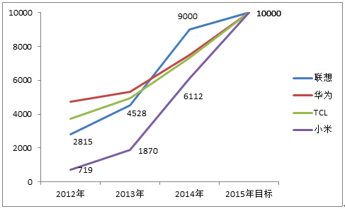 2015年是個關鍵節(jié)點,這一年將有幾家國產(chǎn)手機廠商的年銷量超過1億部。曾對外表態(tài)2015年目標是超1億部的廠商有5家。中興三年前年銷量已經(jīng)近7000萬部,三年目標中提過,但歷經(jīng)虧損轉型,目前看不現(xiàn)實。而且中興終端事業(yè)部CEO曾學忠曾明確表示,2015年中興智能手機銷量目標是6000萬部,按當前手機市場智能機占比90%倒推,2015年中興全部手機銷量目標在6600-7000萬部。剩下的四家分別是聯(lián)想、華為、TCL、小米,我們來逐一分析一下。