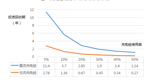分析充電樁項(xiàng)目的投資與運(yùn)營(yíng)情況可以發(fā)現(xiàn),充電樁的投資回收期與充電樁的使用率關(guān)系密切。對(duì)于交流慢充樁來(lái)說(shuō),使用率為5%的情況下,回收期需要近3年,若提升使用率到30%(每天充電8小時(shí)),則投資回收期被縮短到半年以內(nèi)。這個(gè)情況對(duì)于直流快充樁表現(xiàn)更為明顯,在使用率為5%和30%的情況下,投資回收期分別為12年和2年。提升充電樁使用率將大幅度縮短充電樁的投資回收期。