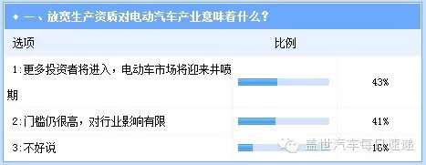 另外,還有一個利好的大背景,在多重鼓勵政策的刺激下,國內(nèi)新能源車市場發(fā)展已經(jīng)明顯提速,而隨著更多投資者的持續(xù)涌入,電動汽車行業(yè)在今后兩年來迎來爆發(fā)并非不可能,在調(diào)查1中,持此觀點(diǎn)者占比43%。
