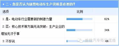 電動汽車的市場化推廣仍面臨著諸多制約,當(dāng)下放寬電動汽車生產(chǎn)資質(zhì)是否是必要的?調(diào)查2的結(jié)果表明,絕大多數(shù)業(yè)內(nèi)對此持肯定態(tài)度,正是因為僅僅依靠當(dāng)前的力量難以打破電動車市場化推廣的堅冰,所以才更需要放寬限制,吸引更多社會力量參與其中。