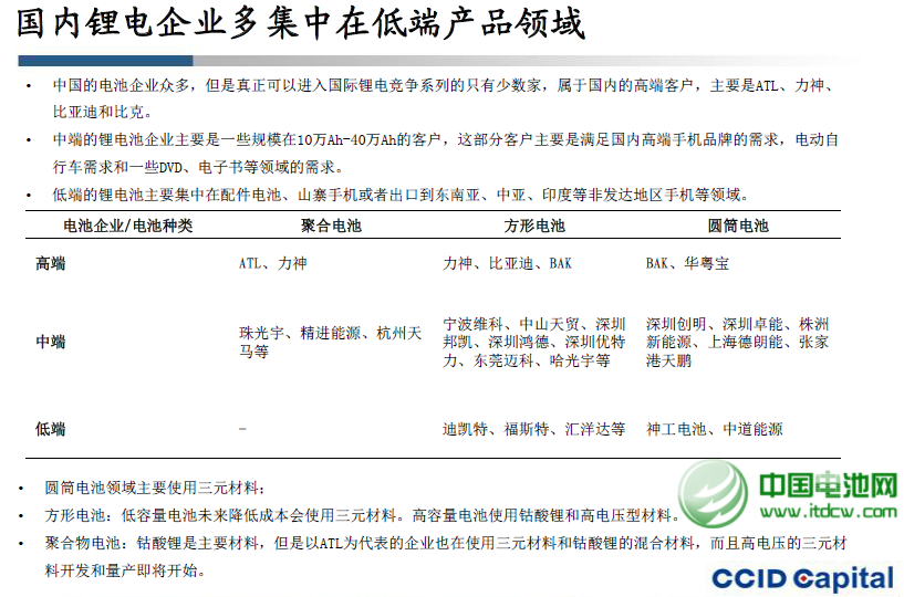 中國(guó)的電池企業(yè)眾多,但是真正可以進(jìn)入國(guó)際鋰電競(jìng)爭(zhēng)系列的只有少數(shù)家,屬于國(guó)內(nèi)的高端客戶,主要是ATL、力神、比亞迪和比克。