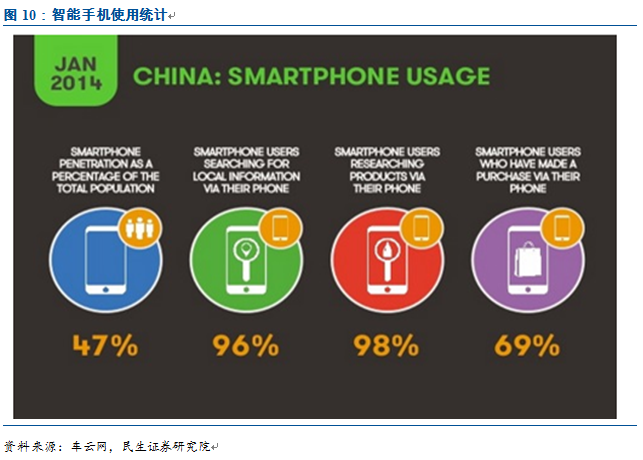 百度Carlife是車聯網手機中心論的典型代表。目前互聯網公司進軍汽車領域之一就是智能車載產品,智能車載產品作為終端設施也是車聯網步步深入的基礎。互聯網公司大多選擇手機作為中介來開發智能車載產品,根據數據顯示,2014年我國智能手機用戶比例達到47%,未來還會不斷提升,智能手機是連接車機實現智能互動的良好中介。目前解決車機和手機的互聯問題有兩種觀點,一種是以手機為中心,另一種是以車機為中心。由于以車機為主,定制型太強,應用種類及手機兼容性方面較差,而手機為中心,互聯網公司能較好的適配,百度的Carlife號稱能兼容95%的手機,是車聯網手機中心論的典型代表。