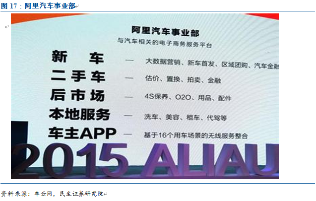 阿里成立汽車事業(yè)部,搭建全新平臺(tái),力圖向車主提供看車、選車、買車、用車、賣車全鏈路的汽車電商服務(wù)。2015年4月,阿里宣布成立汽車事業(yè)部,由原