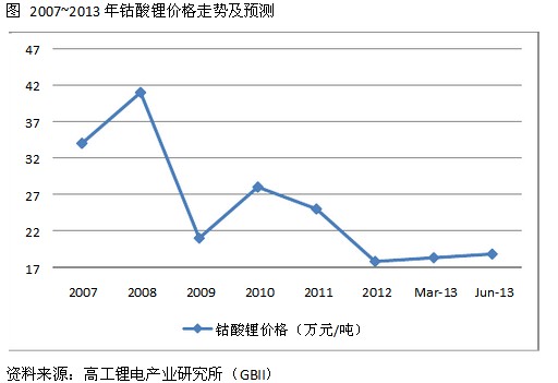 2008年以來,鈷酸鋰價格持續(xù)下滑,從接近42萬元/噸的高位持續(xù)回落到2012年年底的17.8萬元/噸,其后在2013年一季度迎來“小陽春”,價格稍微上漲到18.3萬元/噸,二季度再接再厲,目前價格接近19萬元/噸。(圖1)