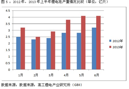智能手機、平板電腦、移動電源等新興市場的持續(xù)高增長直接帶動了鋰電池產(chǎn)量的同比大幅增長,而這也成為鈷酸鋰消費強有力的增長點。根據(jù)高工鋰電產(chǎn)業(yè)研究所(GBII)調(diào)研,2013年上半年鋰電池產(chǎn)量為20.48億自然只(折合成2200mAH18650的規(guī)格統(tǒng)計),相比2012年的16億只同比增長28%(圖4)。隨著去庫存化的完成,鋰電池企業(yè)生產(chǎn)趨旺,行業(yè)呈現(xiàn)初步的好轉(zhuǎn)趨勢,直接帶動了鈷酸鋰的需求增長。