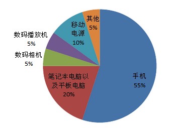 隨著技術(shù)的進步、3G的應用、數(shù)碼產(chǎn)品的普及,基于無線體驗的移動設備的需求越來越大,而目前能夠滿足移動設備待機要求的成熟電池只有鈷酸鋰電池,事實上,在消費類數(shù)碼產(chǎn)品領(lǐng)域,鈷酸鋰電池仍然處于主導地位。從終端需求來看,我國鈷酸鋰的市場55%是針對手機,20%是針對筆記本及平板電腦,5%是數(shù)碼相機/攝像機,5%是MP3/MP4/DVD數(shù)碼播放機,10%是移動電源,5%是藍牙耳機/游戲機等市場。(圖3)