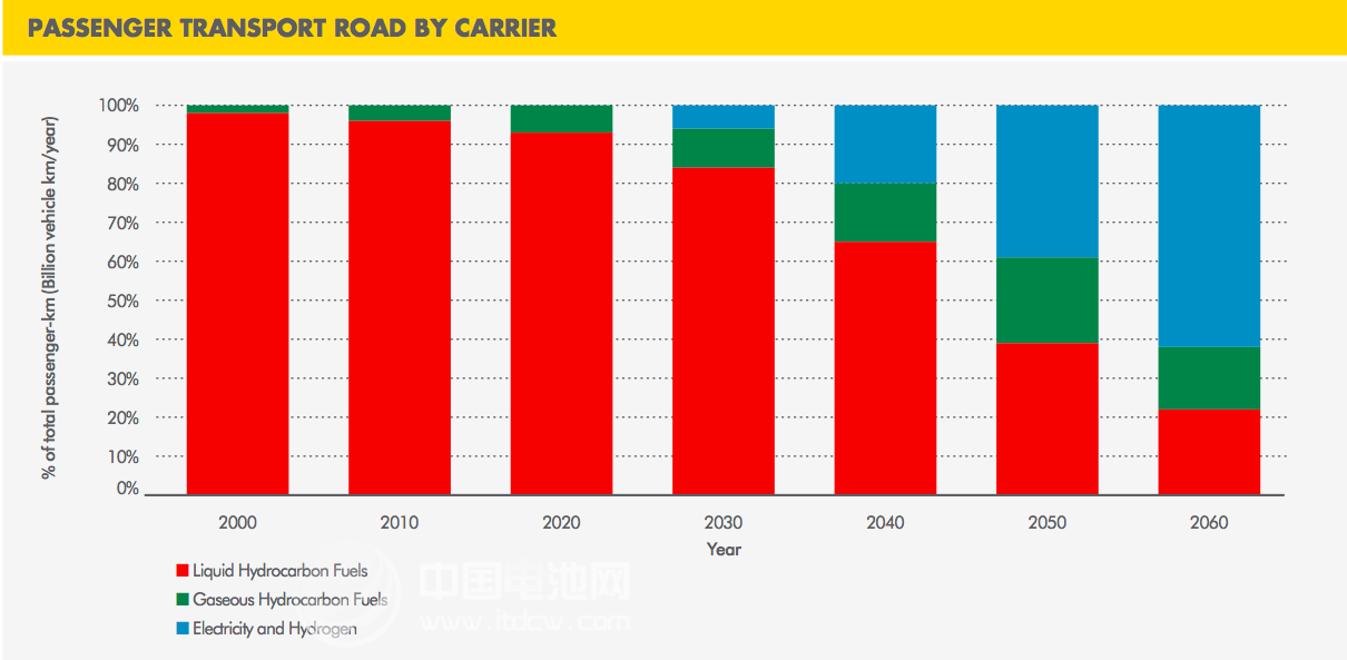 從2030年前后,電力、氫氣開始逐步接管汽車能源市場。盡管目前我們已經看到了許多電動車型與氫能源車型,但與化石燃料驅動的車型相比,相對來說還是微乎其微。電動車的普及率在北美和歐洲市場還比較可觀,但氫燃料電池汽車在世界范圍內都沒有得到普及。殼牌石油預測,到了2070年,乘用車市場將全面脫離對化石燃料的依賴,電動汽車將得到全面普及。