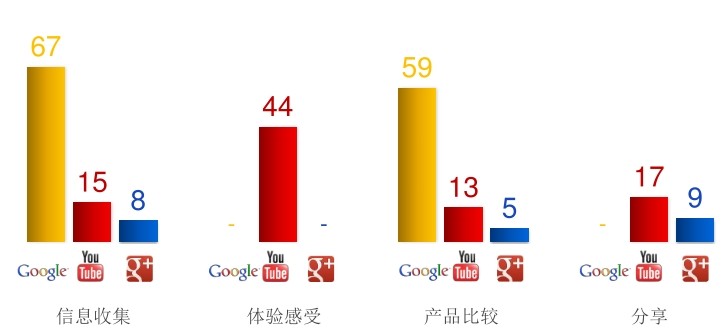 以谷歌的產(chǎn)品為例,谷歌搜索在信息收集和產(chǎn)品比較階段的影響非常明顯,六成消費(fèi)者曾使用過谷歌搜索收集信息和產(chǎn)品比較;YouTube主要體現(xiàn)在體驗(yàn)感受階段,超過四成體驗(yàn)者會(huì)通過YouTube進(jìn)一步理解產(chǎn)品,17%會(huì)通過YouTube進(jìn)行分享;Google+社交網(wǎng)絡(luò)更多體現(xiàn)在信息收集和分享階段。