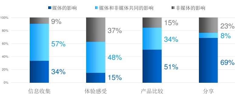 1.在傳統(tǒng)媒體的基礎(chǔ)上,網(wǎng)絡(luò)媒體將媒體的影響提升了一倍乃至九倍,尤其在體驗(yàn)感受階段,線上媒體提升超過了九倍。