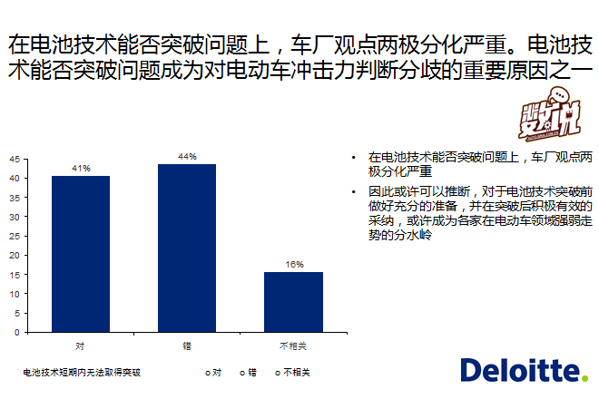 3、 在電池技術能否突破問題上,車廠觀點兩極分化嚴重。電池技術能否突破問題成為對電動車沖擊力判斷分歧的重要原因之一。