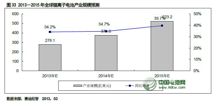 就中國市場而言,得益于動(dòng)力鋰離子電池的快速發(fā)展,2013 年鋰離子電池整體市場規(guī)模將達(dá)到741.7 億元,同比增長33.2%,并且未來三年市場規(guī)模增速均會(huì)保持在30%以上,到2015 年整個(gè)中國鋰離子電池的市場規(guī)模將突破1000 億元,達(dá)到1251.5 億元。