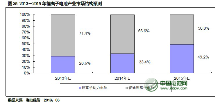 從鋰離子電池市場結(jié)構(gòu)來看,中國電池網(wǎng)戰(zhàn)略合作機(jī)構(gòu)——賽迪顧問認(rèn)為,鋰離子市場規(guī)模未來三年內(nèi)增長的動(dòng)力來自于以新能源汽車電池為代表的動(dòng)力電池。到2015 年鋰離子動(dòng)力電池市場規(guī)模占比將達(dá)到49.2%。
