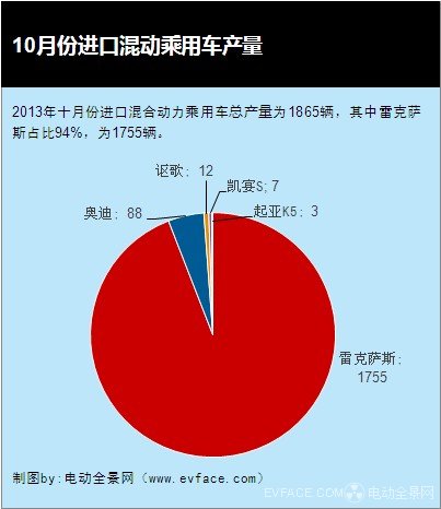 2013年十月份進(jìn)口混合動(dòng)力乘用車總產(chǎn)量為1865輛,其中雷克薩斯占比94%,為1755輛。排在第二位的是奧迪牌,為88輛,謳歌、凱宴、起亞加起來不過22輛,雷克薩斯的零頭都不到,只占總產(chǎn)輛的1