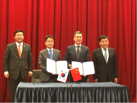 右起:中國(guó)工業(yè)和信息化部部長(zhǎng)苗圩、閃聯(lián)信息產(chǎn)業(yè)協(xié)會(huì)理事長(zhǎng)孫育寧、韓國(guó)電子部品研究院院長(zhǎng)樸清遠(yuǎn)、韓國(guó)產(chǎn)業(yè)通商資源部長(zhǎng)官周亨煥