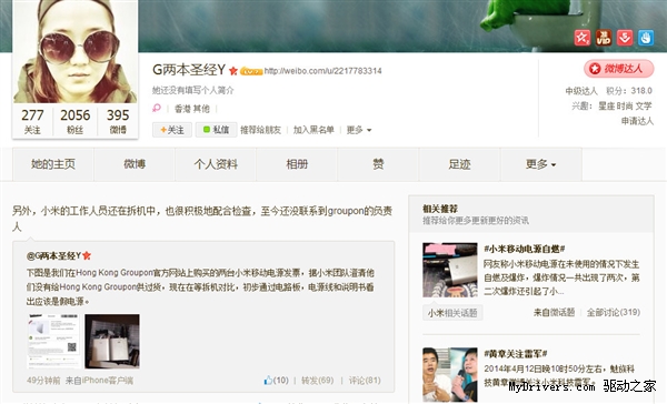 移動(dòng)電源發(fā)生爆炸的用戶@G兩本圣經(jīng)Y剛剛也在微博上表示她買到的確實(shí)不是正品小米移動(dòng)電源,具體是從Hong Kong Groupon官網(wǎng)上購買的,而小米則表示他們并沒有給Hong Kong Groupon供過貨。
