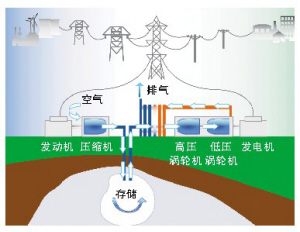 空氣被泵入地下儲藏室(耗盡的天然氣井或鹽穴),并且在那里被存儲下來。直到需要時,空氣經過加壓從儲藏室中釋放出來,用來驅動發電機發電。