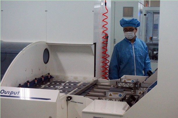 在生產車間,中國光伏產品仍在有序的進行生產。(央視網記者郭城 攝影)