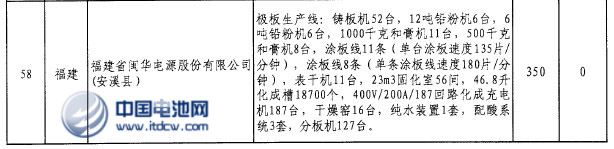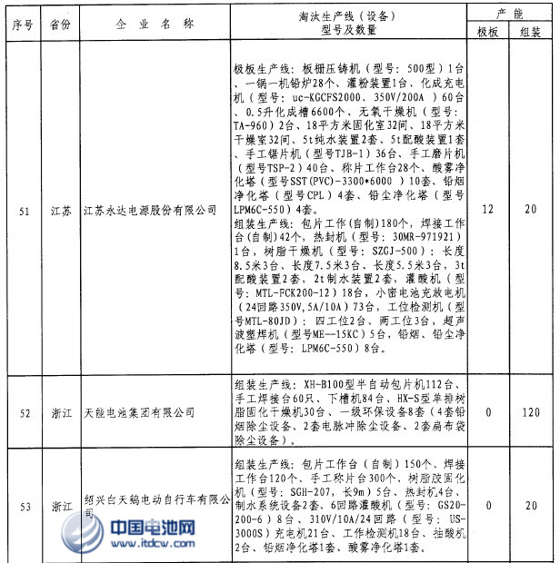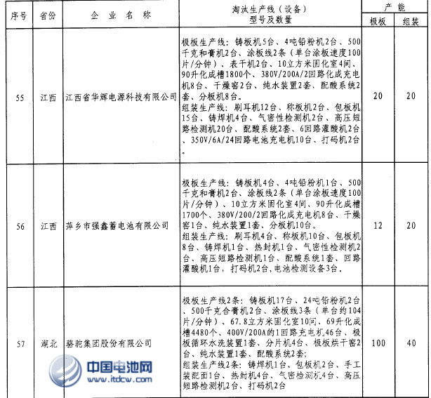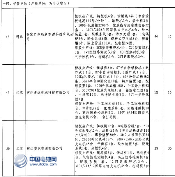 中國(guó)電池雜志-中國(guó)電池網(wǎng)9月17日訊(肖何 北京報(bào)道)工信部網(wǎng)站發(fā)布2013年第46號(hào)公告2013年第三批工業(yè)行業(yè)淘汰落后產(chǎn)能企業(yè)名單,鉛蓄電池行業(yè)有11家赫然上榜,分別是張家口保勝新能源科技有限公司、宿遷博遠(yuǎn)電源科技有限公司、宿遷雷克電源有限公司、江蘇永達(dá)電源股份有限公司、天能電池集團(tuán)有限公司、紹興白天鵝電動(dòng)自行車有限公司、泗縣惠豐電源有限公司、江西省華輝電源科技有限公司、萍鄉(xiāng)市強(qiáng)鑫蓄電池有限公司、駱駝集團(tuán)股份有限公司、福建省閩華電源股份有限公司(安溪縣),其中極板生產(chǎn)線(設(shè)備)629條,組裝生產(chǎn)線(設(shè)備)311條。