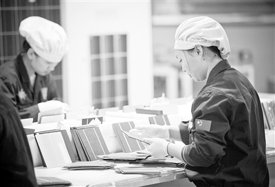 圖①:英利組件車間員工對電池片進(jìn)行二次分選。