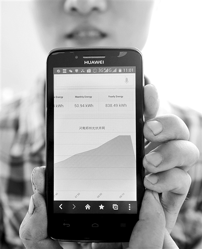 圖②:鄭州市上街區(qū)口頭村村民張海潤在自家房頂安裝的光伏發(fā)電設(shè)備通過了鄭州供電公司的檢測。現(xiàn)在他可以在手機(jī)上查看個人光伏發(fā)電系統(tǒng)的實時信息。