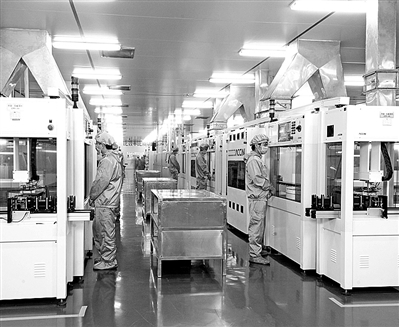圖③:在英利的太陽能電池生產(chǎn)車間,員工們查看機(jī)器生產(chǎn)情況。