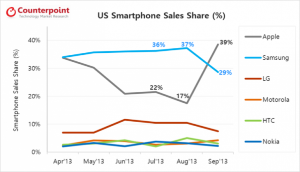 根據(jù)Counterpoint Research最新公布的數(shù)據(jù),iPhone 5s的強(qiáng)勁市場(chǎng)需求量讓蘋(píng)果成功取代了三星,成為了美國(guó)9月份智能手機(jī)市場(chǎng)銷(xiāo)量第一的手機(jī)。據(jù)悉,蘋(píng)果9月銷(xiāo)售份額達(dá)到了39%,三星曾下跌到了29%。